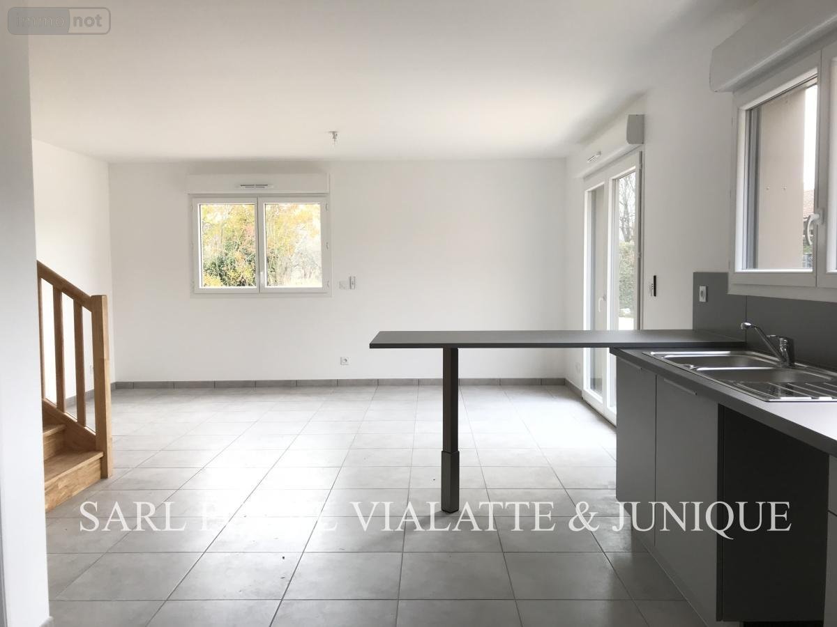 AMBERIEU EN BUGEY, Villa contemporaine T4 "ossature bois et toiture végétalisée" comprenant : - Rdc : entrée avec placards muraux, cuisine équipée de meubles et une hotte ouverte sur séjour, buanderie et WC. - A l'étage : dégagement, 3 chambres avec placards muraux, salle d'eau et WC. Jardin clos d'env. 50 m² et 2 places de parking privées. Chauffage gaz ind et chauffe eau thermodynamique. Classe énergie B Libre Loyer 1 200 € + charges 20 € (parties communes + TEOM) Dépôt de garantie 1 200 € Frais de bail env. 900 € Les informations sur les risques auxquels ce bien est exposé sont disponibles sur le site Géorisques : www.georisques.gouv.fr