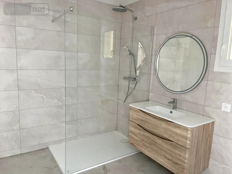 Salle d'eau design : Un espace moderne équipé d'une large douche, d'un meuble vasque contemporain et d'un sèche-serviettes.