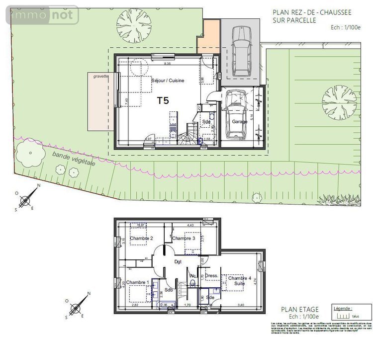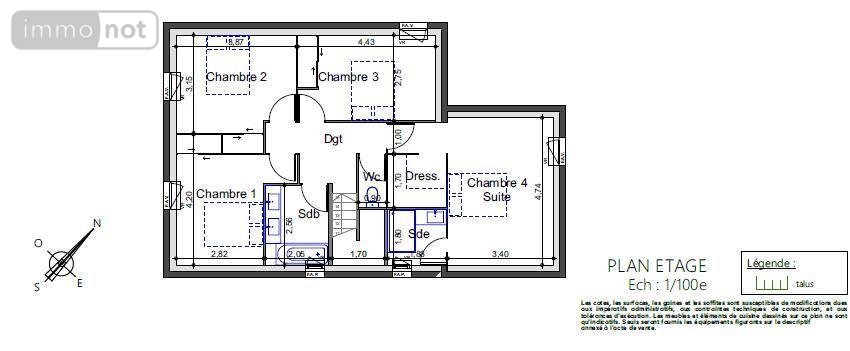 - A l'étage : dégagement, trois chambres avec placard (12 - 13 et 12 m2), salle de bains, W.C, suite parentale (25 m2) avec dressing et salle de bains.