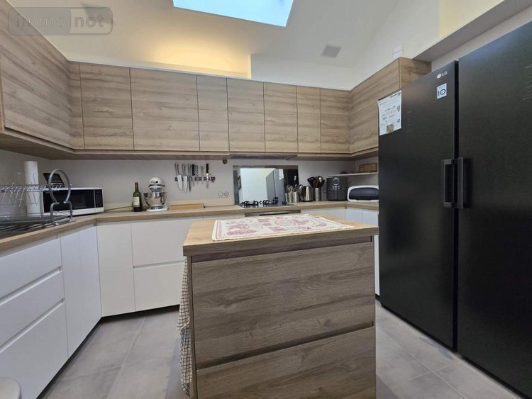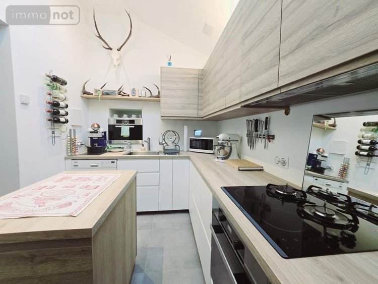Au rez-de-chaussée : une petite terrasse, une entrée, un séjour chaleureux avec poêle à bois ouvert sur la salle à manger, ainsi qu'une cuisine équipée de qualité.