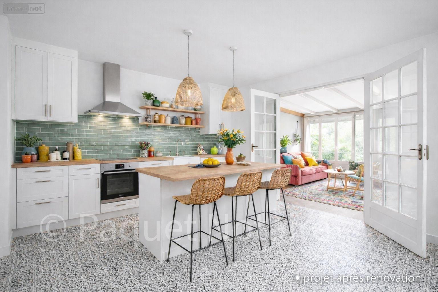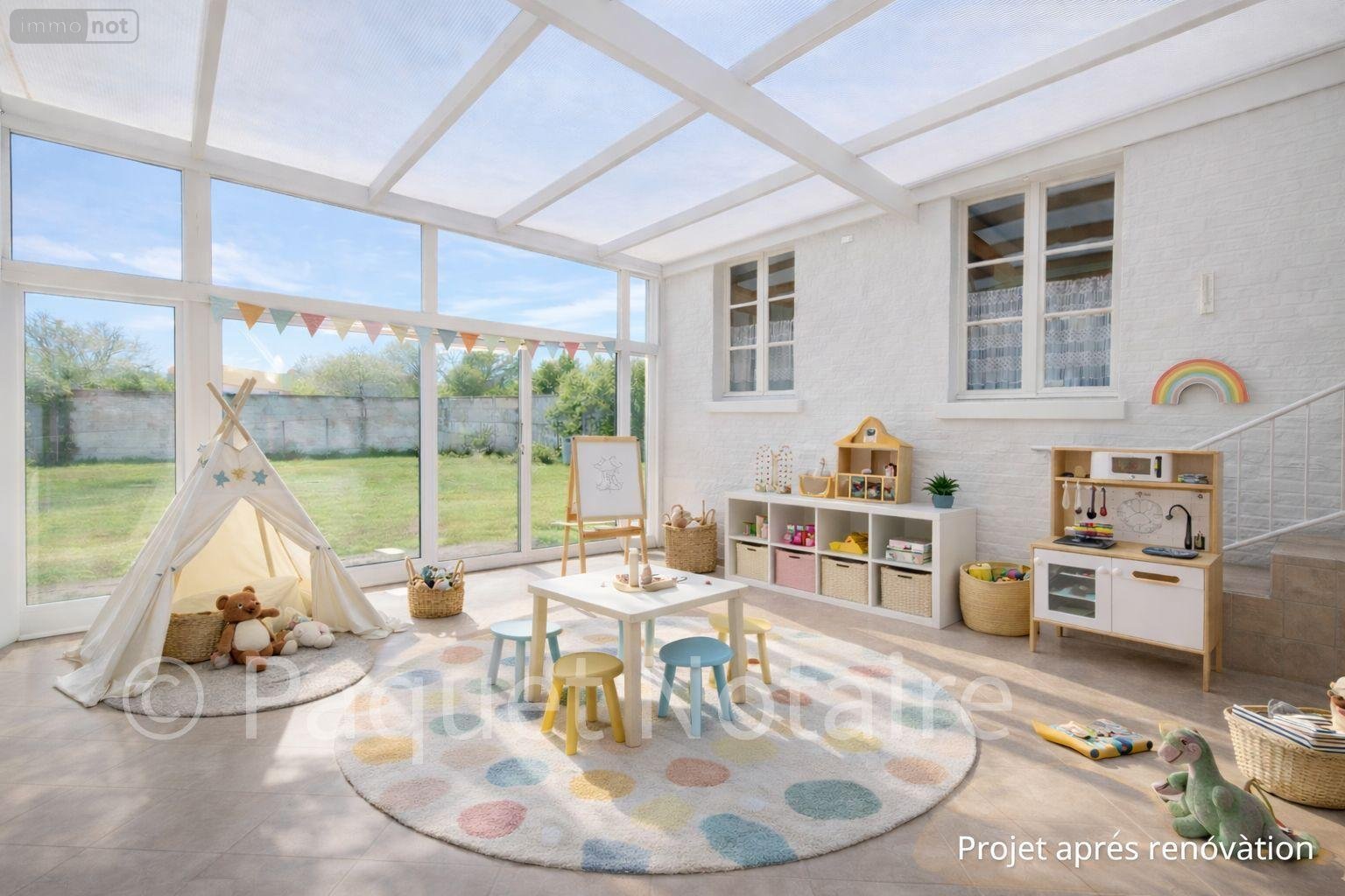 Maison comprenant grand séjour avec cheminée, salle à manger, cuisine, salle d'eau, WC et un garage donnant sur une immense véranda lumineuse
