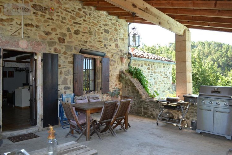A vendre à Chassiers, Ardèche (07) - Une grande bâtisse de caractère en pierres avec terrain attenant de 8806 m² agrémenté d'une piscine - Source sur le terrain - Dans un secteur très calme, le terrain exposé Sud-Ouest offre une très belle vue - Surface habitable : 162 m² environ - Rez-de-chaussée : Petite cour intérieure avec une belle voute sous terrasse, Buanderie voutée 12 m², cave voutée 6 m², Chambre d'appoint voutée 24 m², salle de bains avec WC 7,60 m², Chambre 11,40 m², Atelier 23 m² avec un coin mezzanine 18 m² (peu de hauteur) - Etage : Terrasse Nord 15 m², Salon avec cheminée en pierre 21 m², Cuisine 19 m², Salle d'eau avec WC 8 m², Salon 29,70 m², Terrasse Sud 35 m², Terrasse Ouest couverte 24 m² - étage : Mezzanine 18 m², Chambre 22 m²