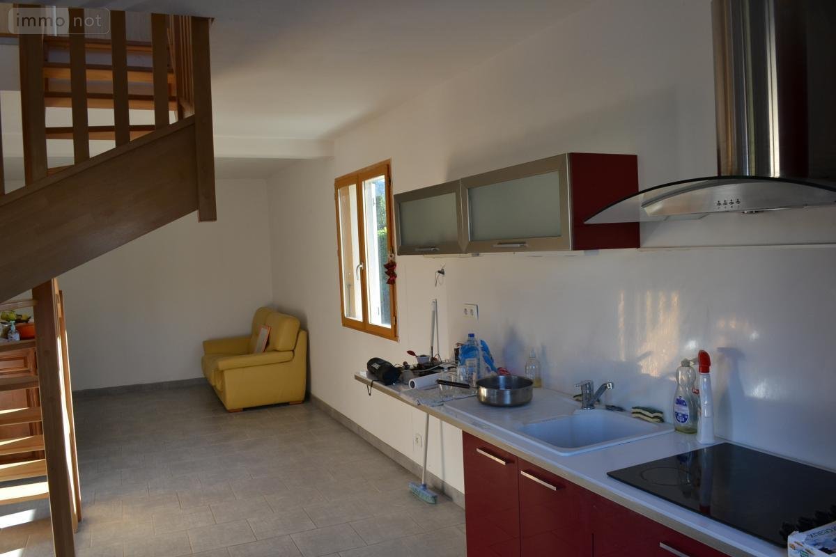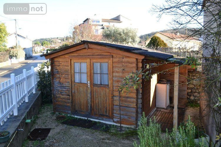A vendre à Ruoms, Ardèche (07) - Une maison individuelle construite en 2014 avec terrain attenant de 315 m² - Située au coeur du village à proximité des commerces - Chalet en bois - Terrain clos - Tout à l'égout - Surface habitable : 61 m² - Rez-de-chaussée : Hall d'entrée 5 m², Cuisine/Séjour 23,90 m², Chambre 12,30 m², WC indépendant 1 m², Salle d'eau 3,50 m² - Etage : Chambre en mezzanine 15,40 m²