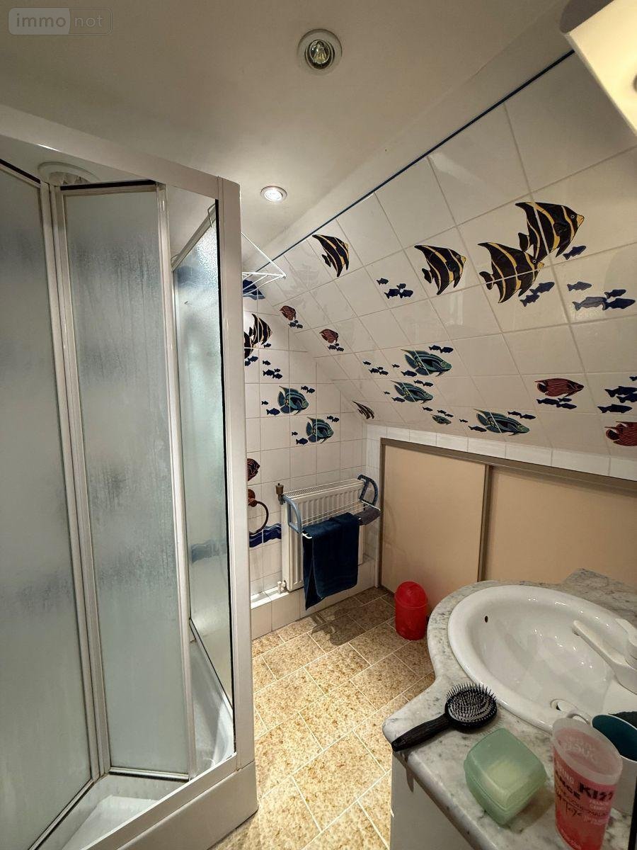 À l'étage, vous trouverez un palier desservant deux chambres mansardées, dont une équipée d'une climatisation, une salle de douches et des WC séparés.