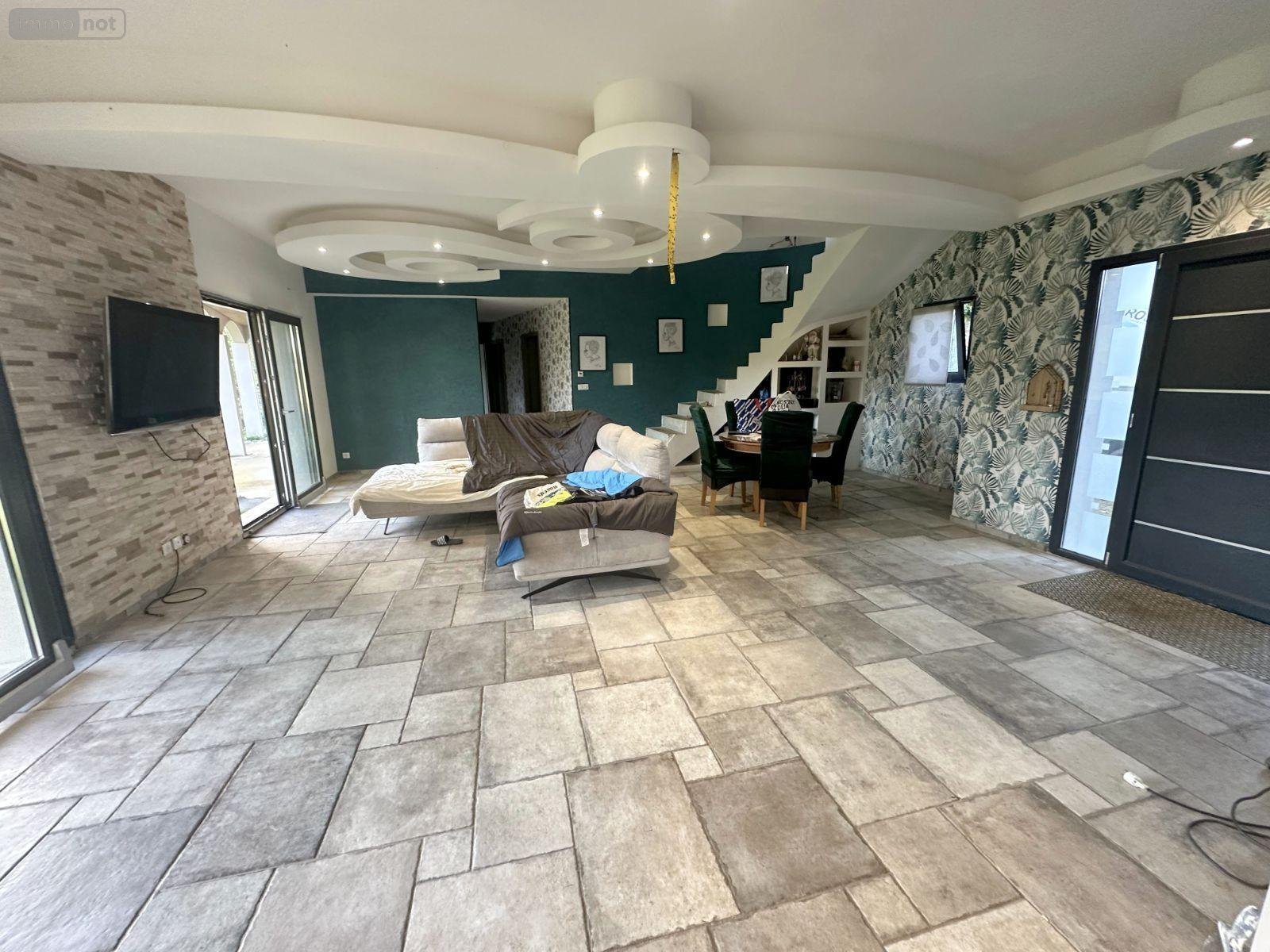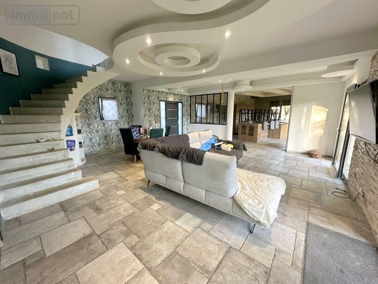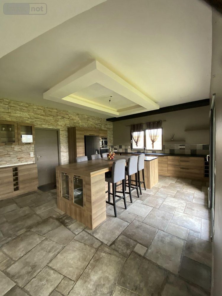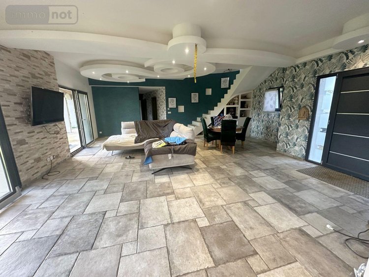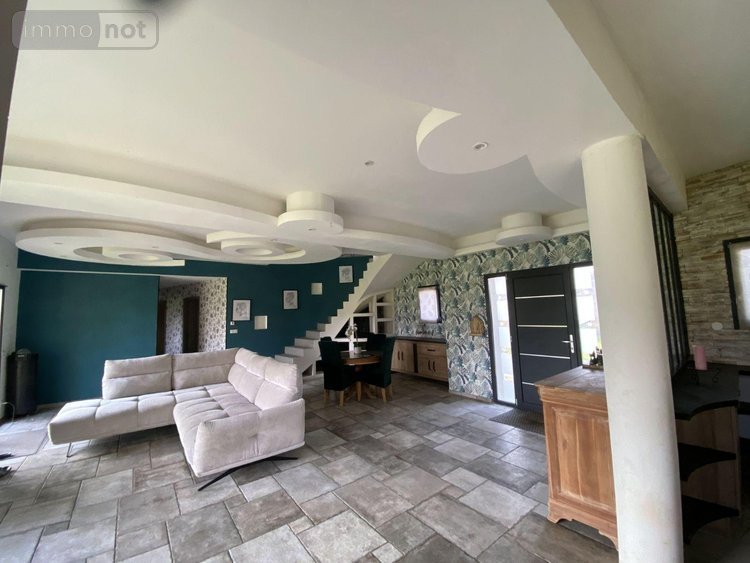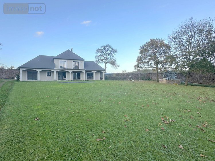 Dans un très bel environnement, au calme, maison récente nouvelle génération (construction Euromac2 bloc coffrant isolant) de type F7 comprenant une vaste pièce de vie, cuisine ouverte équipée avec coin repas, deux grandes chambres, une salle de bains avec douche, un bureau et un WC indépendant. A l'étage, palier desservant trois belles chambres dont deux accès terrasse, et un WC. Double garage attenant isolé. Le tout sur un terrain en partie clos de murs et arboré d'environ 2670 m² avec jolie vue dégagée et dépendances. .