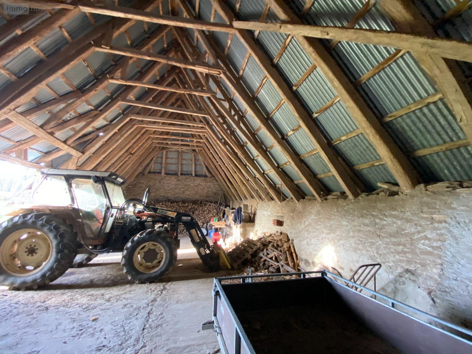 b) Une grange en pierre d'environ 110m² avec charpente traditionnelle et couverte en tôle, appentis en bois couvert en tuile mécanique, un plancher béton.