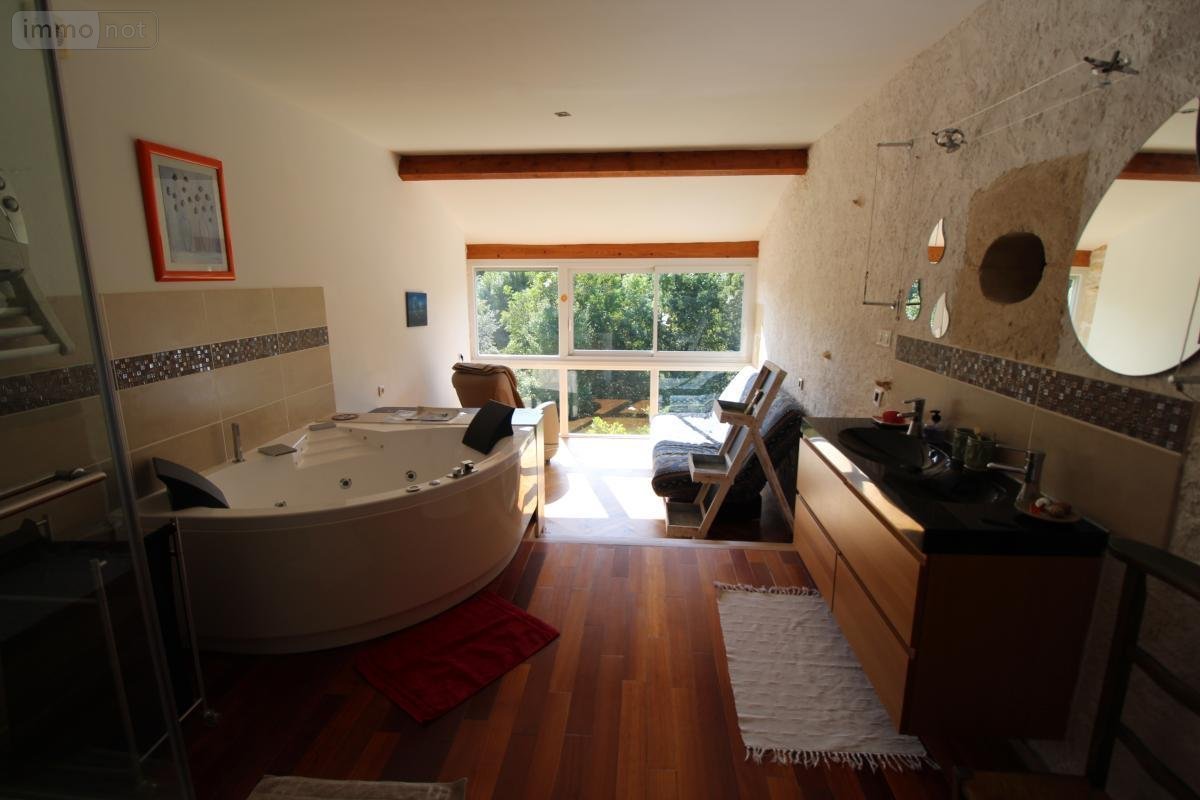 Elle se compose d'une cuisine équipée moderne, un séjour de 33 m² avec pierres apparentes et mangeoire, une salle à manger avec cheminée, une chambre et une salle d'eau en rdc, un wc; à l'étage un dégagement avec 4 chambres, une salle de bains avec douche, wc.