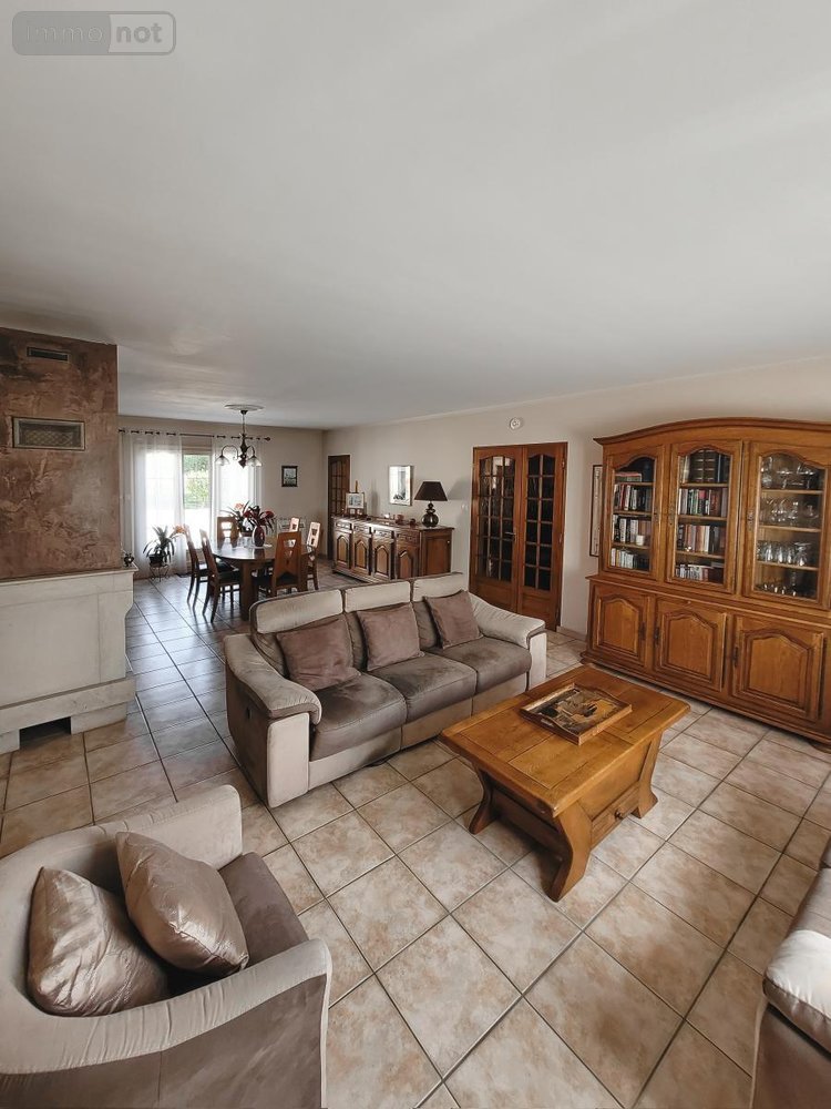 La maison comprend au rez de chaussée entrée, couloir desservant d'une part une chambre, cuisine, salle de douche, et d'une part un grand salon ouvrant sur terrasse avec cheminée, cuisine équipée, toilettes, rangements. A l'étage dégagement avec quatre chambres, salle de bains, grenier. Un grand garage avec point d'eau ; Cave ;