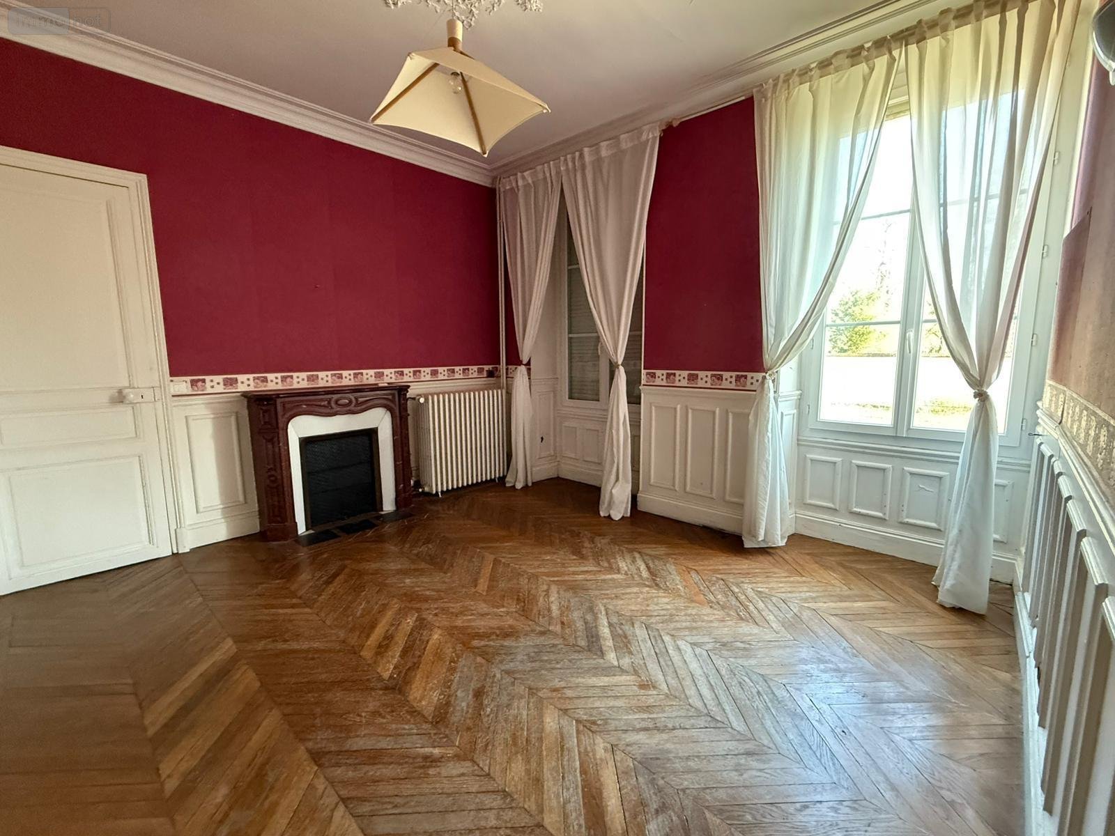 Concernant la maison principale : Une entrée de 13 m² (carreaux de ciment) permet d'accéder à un grand salon et un bureau (60 m² avec deux cheminées), parquet chêne d'origine, WC et lavabo, une pièce de rangement, une chambre de 16 m² avec cheminée et placard, une cuisine équipée de 34 m² et un accès au terrain.