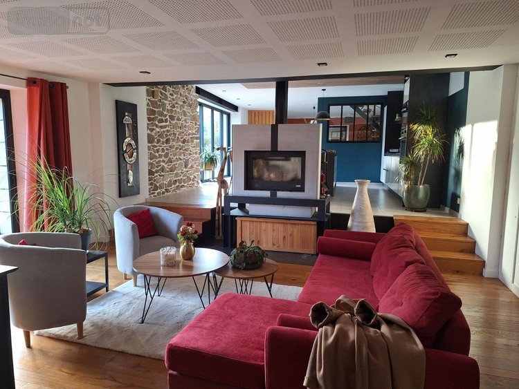 - au rez-de-chaussée : une grande pièce de vie consistant en un salon, un séjour, une cuisine ouverte aménagée et un coin rangement, un wc avec un point d'eau, un coin bureau, une entrée et une buanderie.