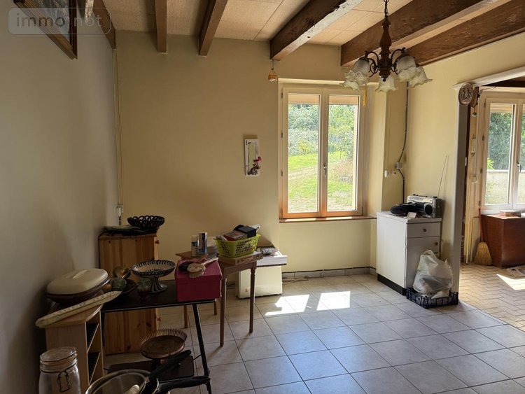 Sur 1 ha 31 a et 81 ca d'un seul tenant, longère composée de deux parties et comprenant 1ère partie : RdC : cuisine / salle à manger, quatre chambres, salle d'eau, WC, cellier et grenier au-dessus. Dans la 2ème partie au RdC : cuisine meublée, salle / salon avec cheminée. A l'étage : deux chambres, salle de bains, WC et grenier. Appentis et garage à l'arrière de la maison. Hangar (en parpaings et tôles) et bâtiment (anciennement à usage d'écurie et un autre garage).