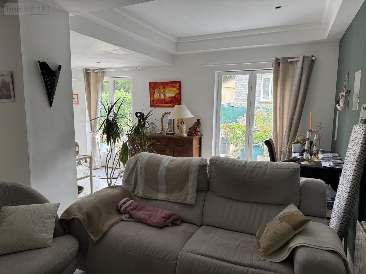 Belle maison en pierres, sous ardoises naturelles, mitoyenne d'un côté (atelier/hangar), sur jardin clos de 461 m2, comprenant une grande pièce à usage de cuisine (meublée/équipée) et repas, un agréable salon avec poêle à pellets, wc/lave-mains ; étage sur parquet de deux spacieuses chambres mansardées, salle de bains avec baignoire, douche et wc.