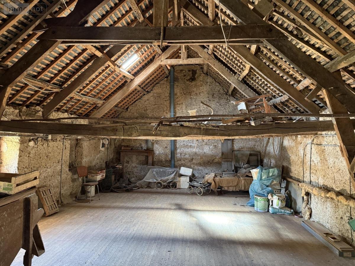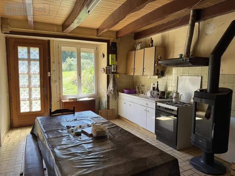 Sur 1 ha 31 a et 81 ca d'un seul tenant, longère composée de deux parties et comprenant 1ère partie : RdC : cuisine / salle à manger, quatre chambres, salle d'eau, WC, cellier et grenier au-dessus. Dans la 2ème partie au RdC : cuisine meublée, salle / salon avec cheminée. A l'étage : deux chambres, salle de bains, WC et grenier. Appentis et garage à l'arrière de la maison. Hangar (en parpaings et tôles) et bâtiment (anciennement à usage d'écurie et un autre garage).