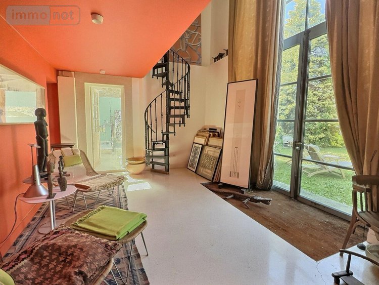 Dirigeons nous vers l'arrière de la maison, un salon cathédral nous reçoit par lequel on accède à la fois à l'étage par un escalier à vis en fer. Mais que dire de la monumentale double porte vitrée qui nous entraine sur le jardin d'agrément ? Bordée de plantations et d'arbres sagement maitrisés, sa belle piscine rectangulaire invite à la fraicheur, bordée par ses plages couvertes de bois.