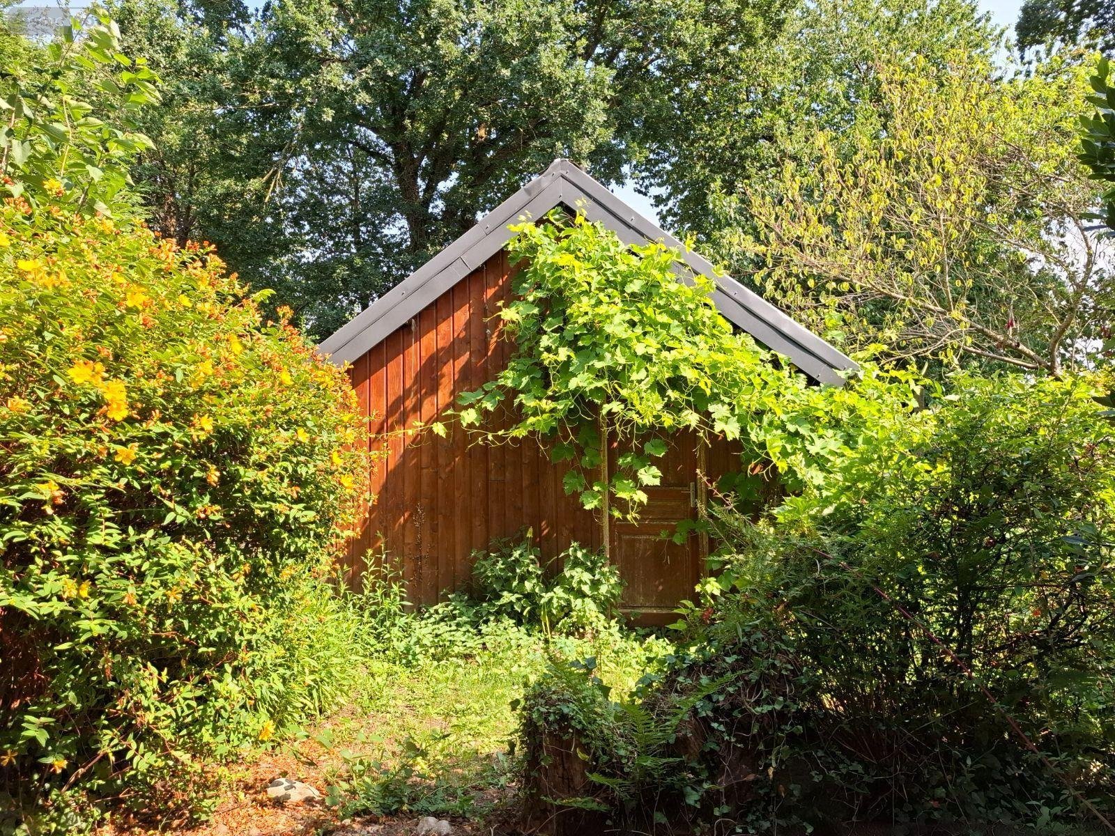 Abri de jardin en bois sous tuiles synthétique avec abri bois attenant,
