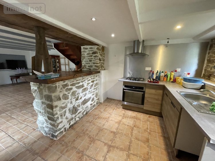 Au RDC: cuisine aménagée et équipée avec poutres et pierres apparentes ouverte sur séjour-salon, salle de d'eau avec wc, buanderie, chambre.