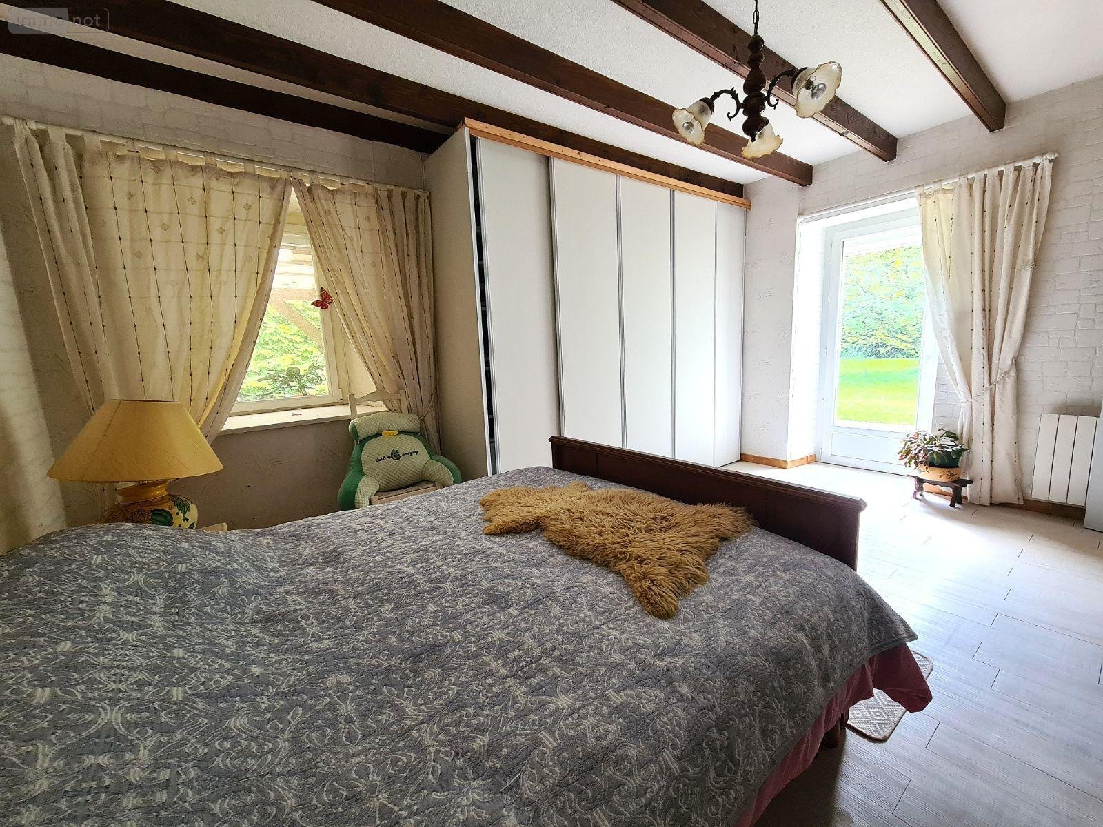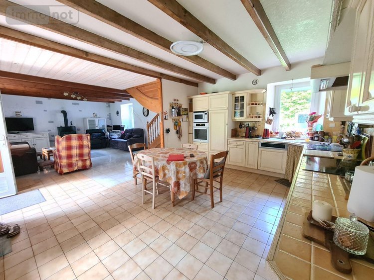 Dans un cadre verdoyant et arboré, longère en pierres sous ardoises composées au rez de chaussée d'une cuisine aménagée et équipée ouverte sur un grand salon/séjour avec poêle à bois, d'une chambre, d'une salle de bains et d'un WC séparé. A l'étage, deux paliers, de part et d'autre de la longère, donnent accès à 5 chambres, une pièce à usage de chambre ou bureau, une salle d'eau avec WC et une pièce d'eau avec WC.