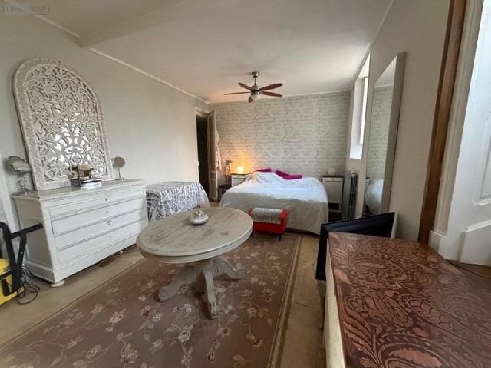 La maison, sur trois niveaux, présente au rez-de-chaussée : une pièce de vie (cheminée, moulures, rosace, boiseries et belle hauteur sous plafond), une cuisine, une chambre, un bureau, toilettes et salle de bains.