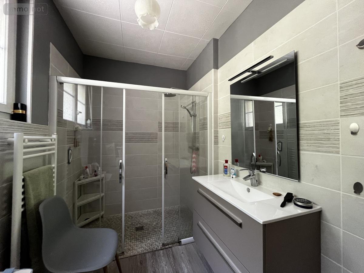 - Au rez-de-chaussée : véranda, entrée, cuisine aménagée et équipée, salle-salon avec cheminée (insert), couloir avec placards desservant un W.C (simple vitrage bois), deux chambres, salle d'eau avec douche à l'italienne récente.