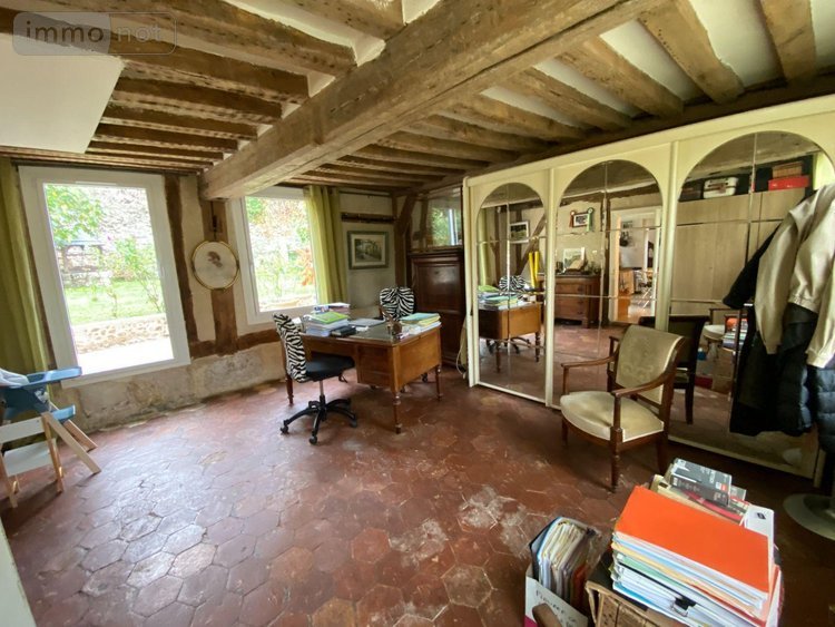 Entrée avec escalier d'époque, cuisine entièrement équipée, salle de séjour- salon avec cheminée (poutres, parquets, boiseries) et lumière traversante, wc suspendu, bureau de 20 m2 (poss chambre).