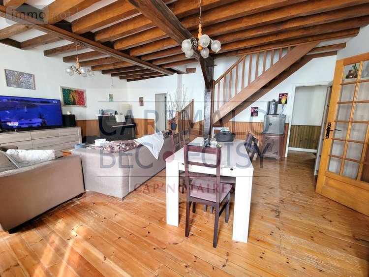 Appartement T4 à l'étage : Entrée sur couloir, pièce de vie avec cuisine aménagée, trois chambres, salle d'eau/buanderie, wc.