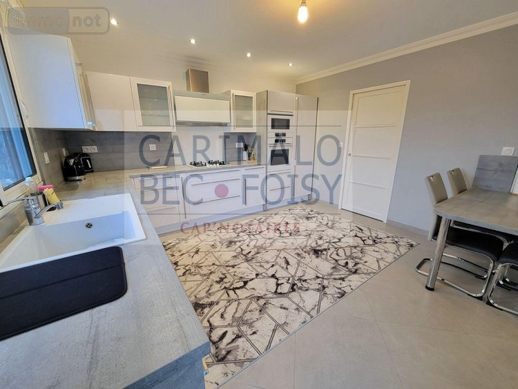 Elle comprend une grande pièce de vie lumineuse avec carrelage moderne, une cuisine aménagée et équipée, un cellier, une buanderie, un garage intégré avec porte motorisée.