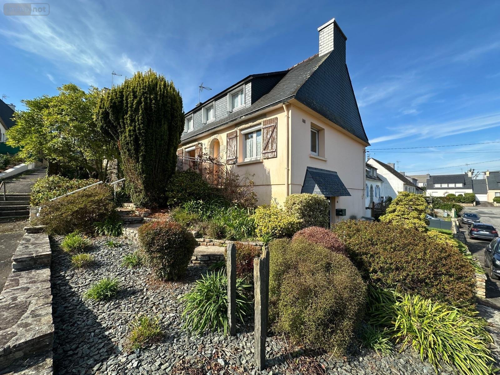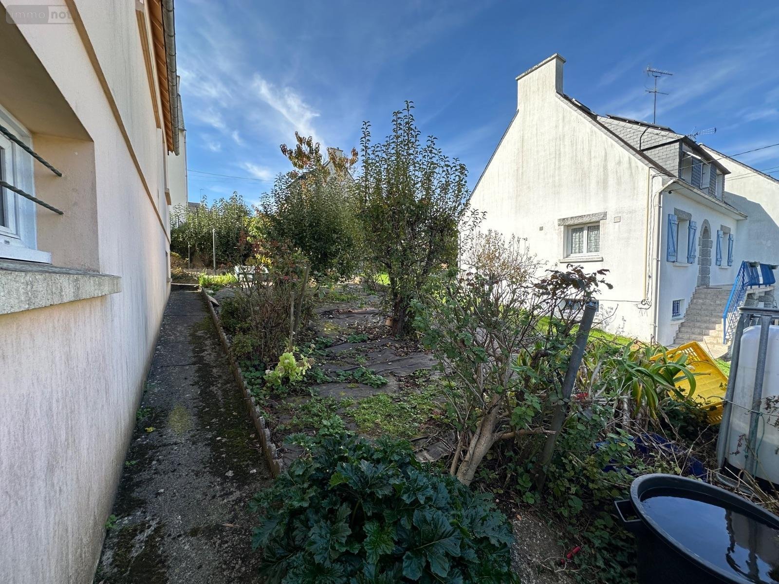 Située en impasse dans le haut de KERFEUNTEUN, à KERMOGUER, maison de 120m² habitables édifiée en 1976 sur une parcelle de 399m² offrant vie de plain-pied ainsi que deux chambres au rez-de-chaussée. Celui-ci se compose d'une entrée, d'un séjour donnant accès direct à une terrasse et jardinet bien exposés, d'une grande cuisine aménagée, de deux chambres spacieuses, de W.C indépendants et d'une salle de bains avec baignoire et douche : pratique pour les enfants! L'étage offre quant-à-lui un couloir, une chambre avec grenier permettant d'aménager un dressing, un grenier à aménager, une salle d'eau avec W.C ainsi qu'une quatrième chambre.