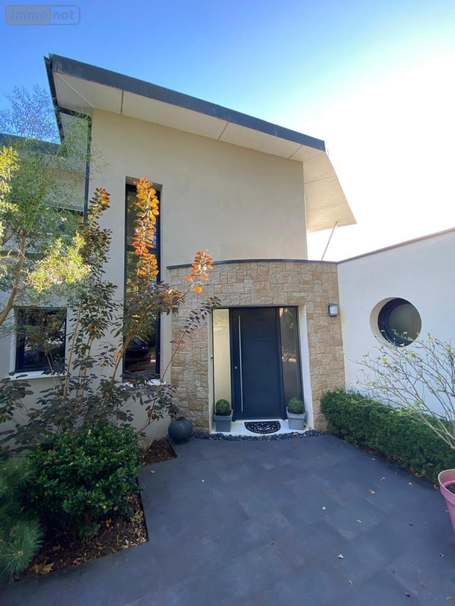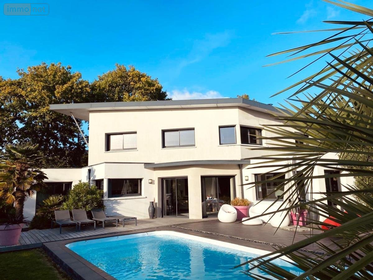 Prestations haut de gamme : pompe à chaleur, cheminée avec insert, aspiration centralisée, volets électriques, double garage, suite parentale avec sauna au rez-de-chaussée, 3 chambres à l'étage, piscine chauffée, jardin paysager, grandes terrasses.