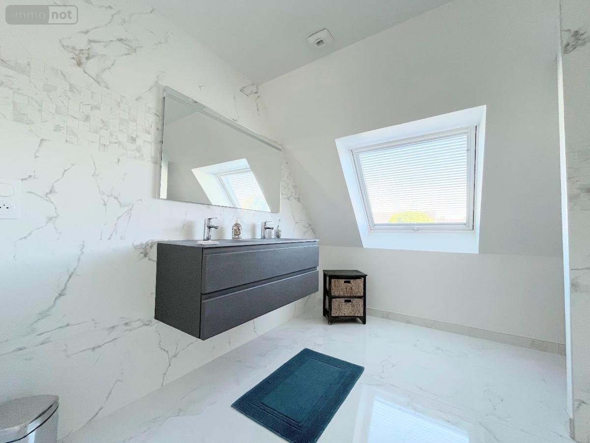 À l'étage, l'espace nuit se compose de quatre chambres, d'un bureau, d'une salle d'eau avec double vasque et d'un WC indépendant.