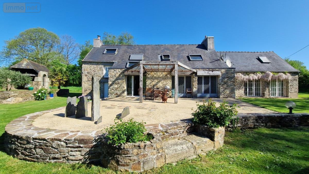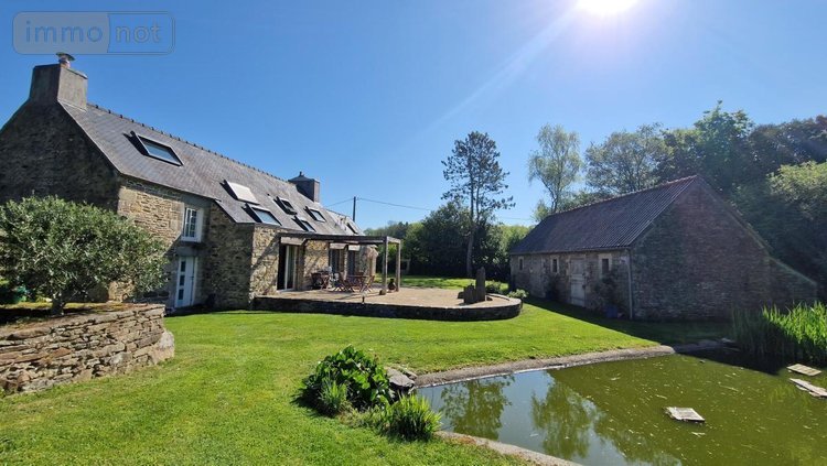 A 13 minutes de MORLAIX, 9 du centre bourg de PLOUGONVEN, dans un environnement bucolique très calme, sans voisins proches, belle propriété de caractère en pierre. La maison comprend en rez-de-chaussée : entrée , buanderie, cuisine aménagée et équipée ouverte sur salon-séjour avec cheminée insert, salle d'eau, wc et deux chambres avec chacune une mezzanine. A l'étage : chambre, salle d'eau avec wc et chambre parentale avec bureau, dressing et sauna. Dépendance en face de la maison comprenant : atelier, pièce de rangement, cave à vin et poulailler. Autre dépendance à usage de garage. Le tout sur un terrain clos de 4449 m², avec terrasse au sud-ouest et mare. Prestations de qualité et propriété sécurisée.