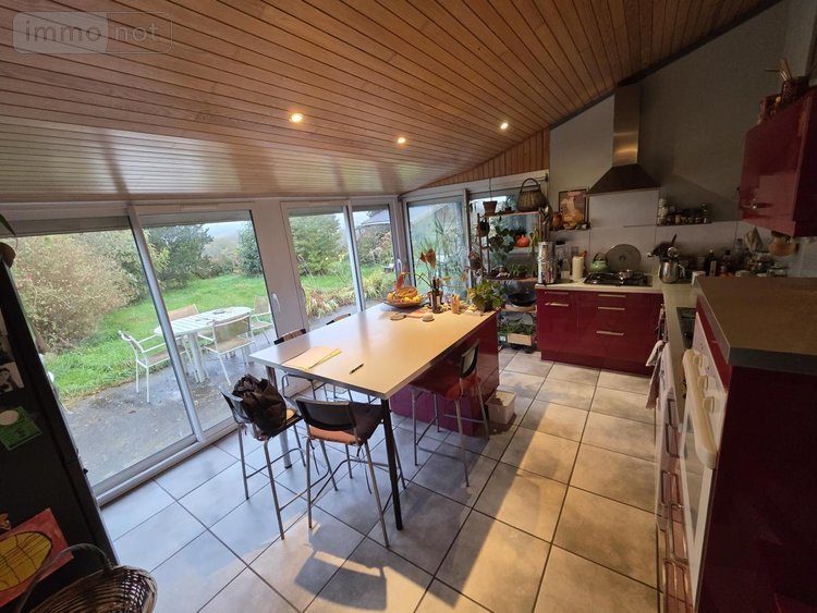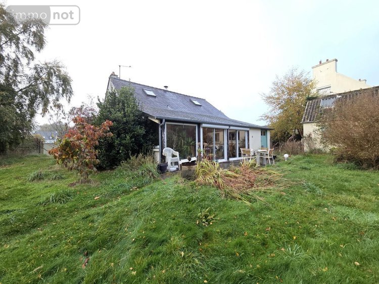 PLOUGONVEN, centre bourg, maison comprenant entrée, salon/séjour avec poêle, cuisine aménagée, 2 chambres, salle d'eau, wc. A l'étage, une mezzanine, une grande chambre. Chaufferie. Garage, abri, atelier. Terrain 960m².