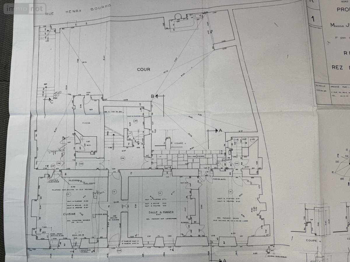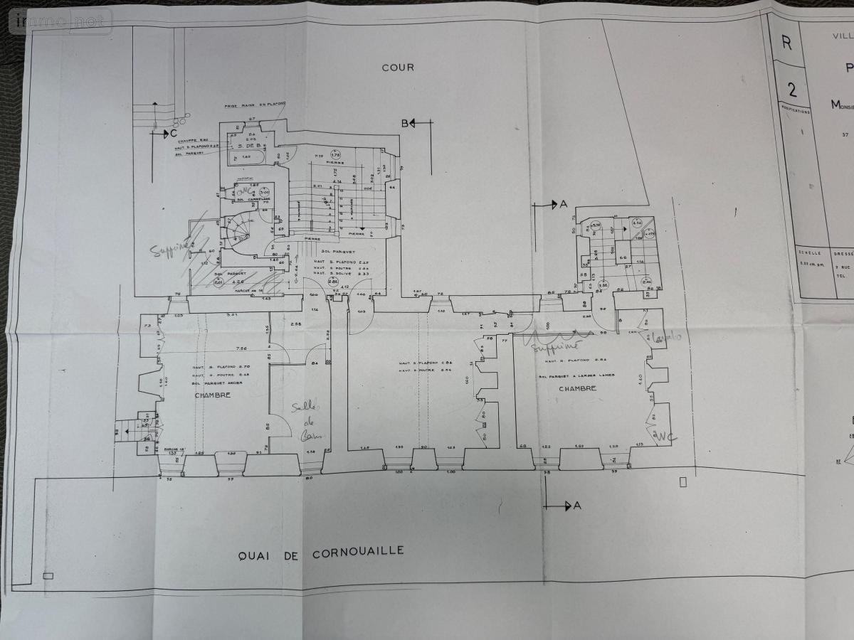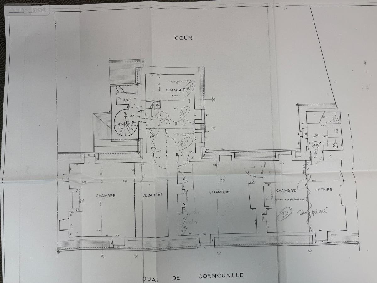 Sur le quai de Cornouaille, Bâtisse dénommée Prieuré Saint Thomas datant du XVIè siècle. Elle nécessite de gros travaux pour lui redonner son lustre d'antan. Elle comprend au rez-de-chaussée le hall d'entrée, cuisine salon, séjour, dégagement vers escalier majestueux en Pierre. Au ½ palier une salle de bains. Au 1er étage : trois chambres, salle de bains-wc, wc. Au 2è étage : deux chambres, atelier, dégagement, grenier (accès escalier de service reliant le rez-de-chaussée). Jardin clos de murs. Terrain 544m²