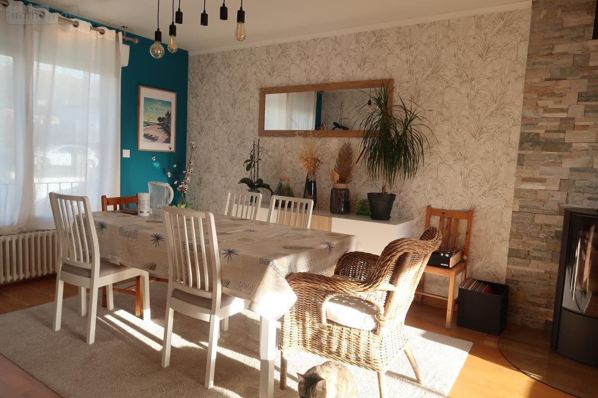 Sur un terrain de 911m², Maison sur sous-sol (garage, buanderie-chaufferie, deux pièces, wc) comprenant: entrée, séjour-salon avec poêle à bois, cuisine aménagée et équipée, chambre, salle de bains-wc. A l'étage: palier, trois chambres, salle d'eau, wc. Garage accolé. Jardin. Travaux 2020 et 2021: Fenêtres, isolation, électricité, poêle, pompe à chaleur, VMC)