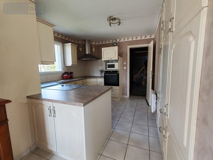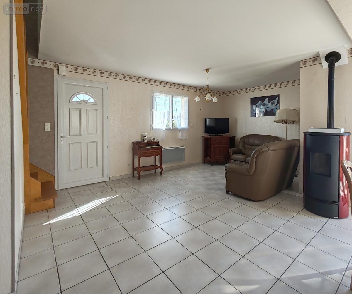La maison propose une vie de plain-pied au rez-de-chaussée : cuisine aménagée et équipée ouverte sur la pièce de vie avec poêle à pellets, avec accès à une terrasse, chambre parentale avec salle d'eau privative et un wc. À l'étage, deux chambres, une salle de bains avec WC et une mezzanine pouvant servir de bureau ou de salle de jeux.