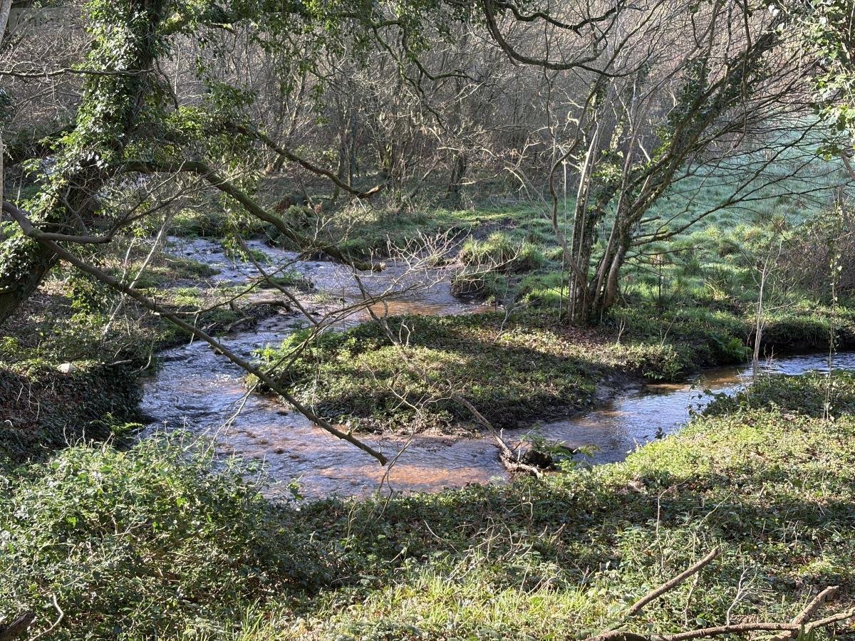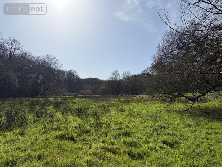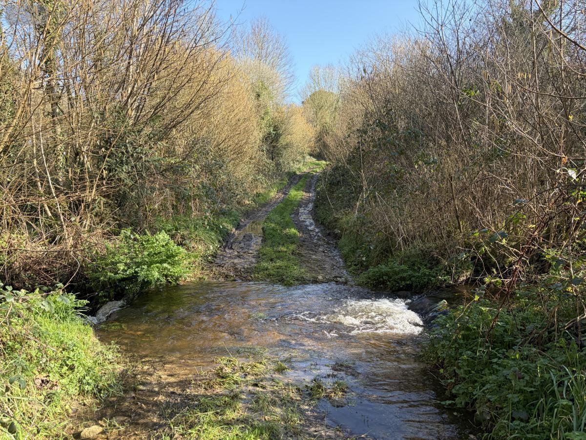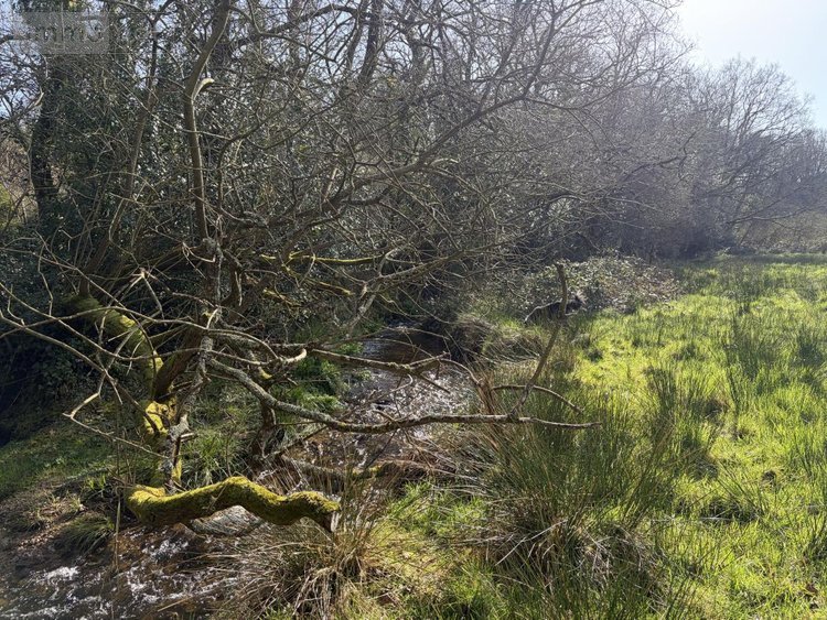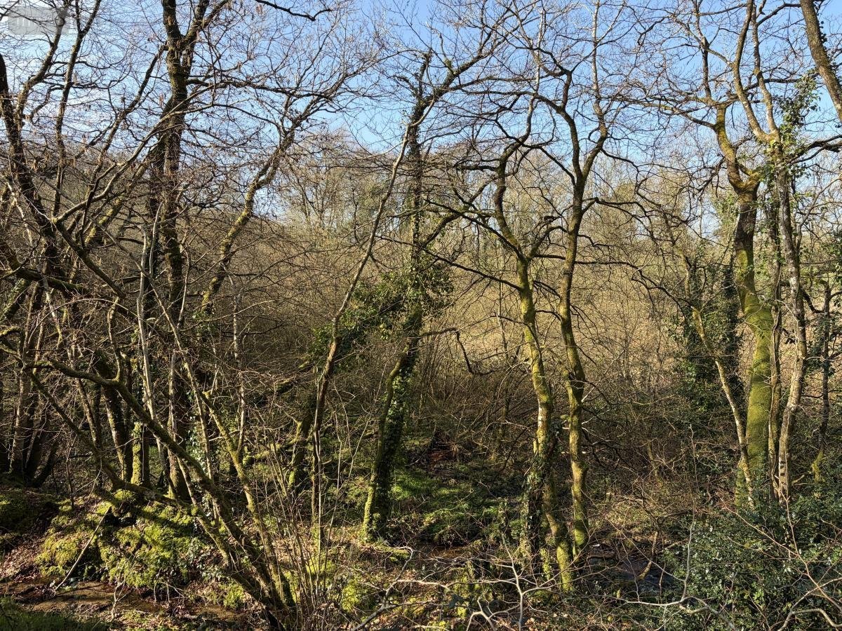 2112 - PLEYBER CHRIST - A 5 min du centre bourg, terrain de 37739m² avec une prairie, un cours d'eau, et une grande partie boisée (couleur bleue).