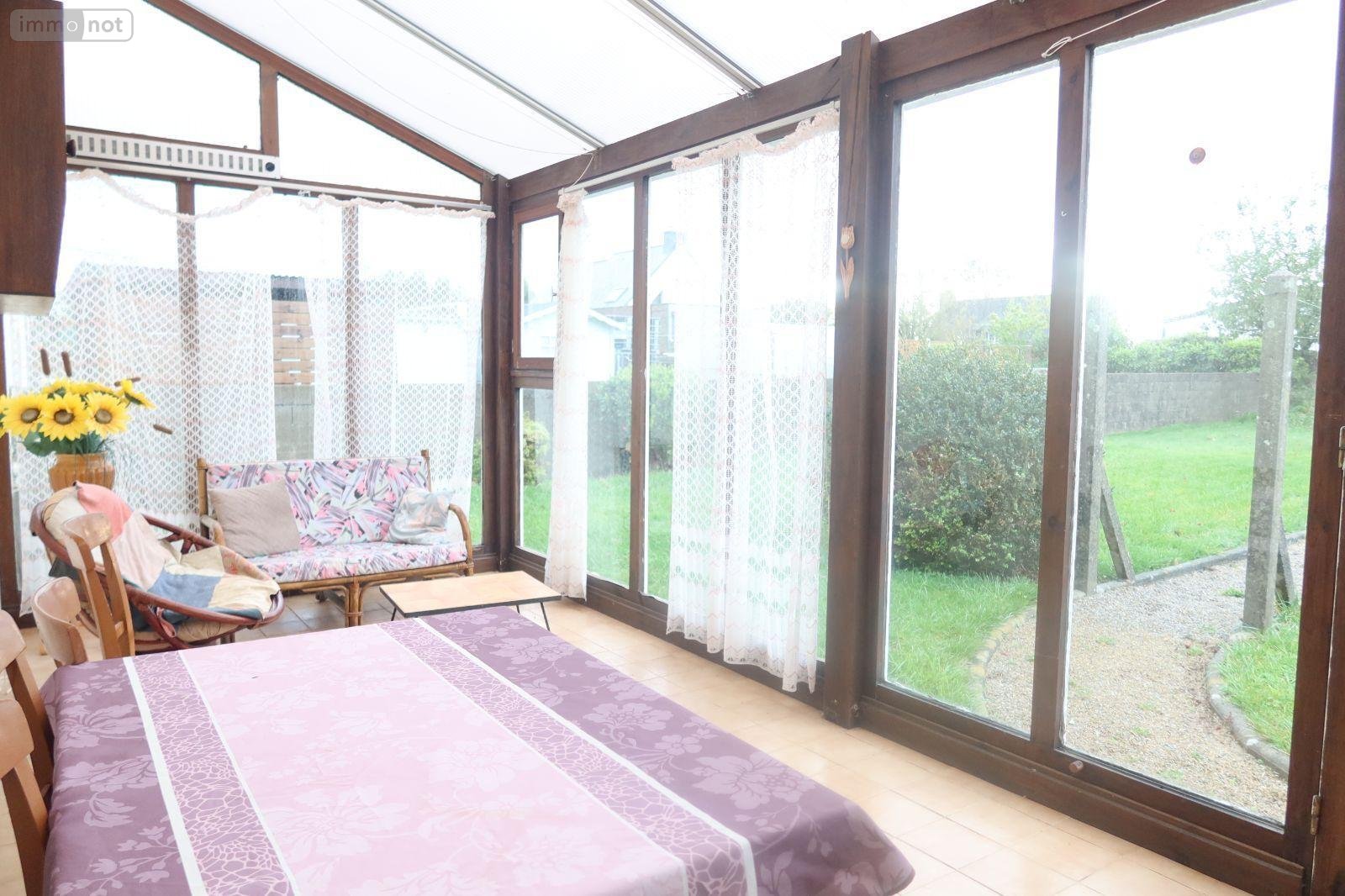 A vendre immobilier- Finistère- LANDIVISIAU- Proximité immédiate du centre-ville , maison d'habitation élevée sur sous sol et composée au rez de chaussée : un sas entrée véranda, un salon-séjour, une cuisine aménagée, une salle d'eau, un w;c; deux chambres, une véranda. Etage : combles ( deux pièces) Sous sol complet. Jardin.Cabanon. Bon état général. Le tout sur une surface totale de 566 m².