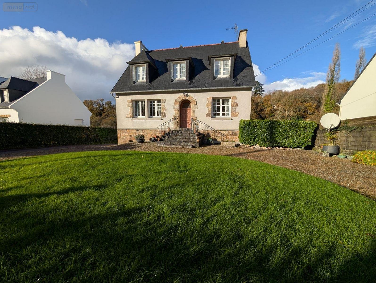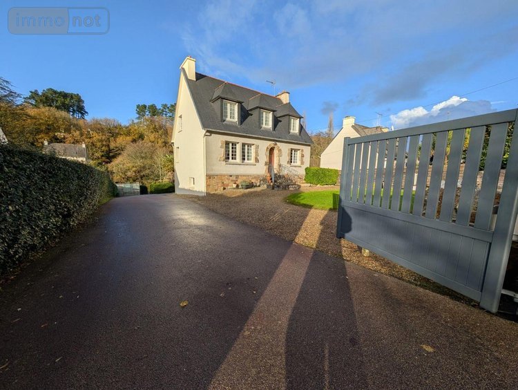 A vendre-Immobilier- Finistère- LA ROCHE MAURICE - A proximité immédiate du bourg, maison d'habitation spacieuse et lumineuse, élevée sur sous sol et composée au rez de chaussée : hall, un séjour, un salon, une cuisine aménagée, une salle d'eau, un w.c., une chambre. Etage : trois chambres, un bureau, un w.c. avec lavabo. Sous sol complet-Jardin- Cabanon- Abris voitures- Le tout sur une surface totale de 1107m². Bon état général.