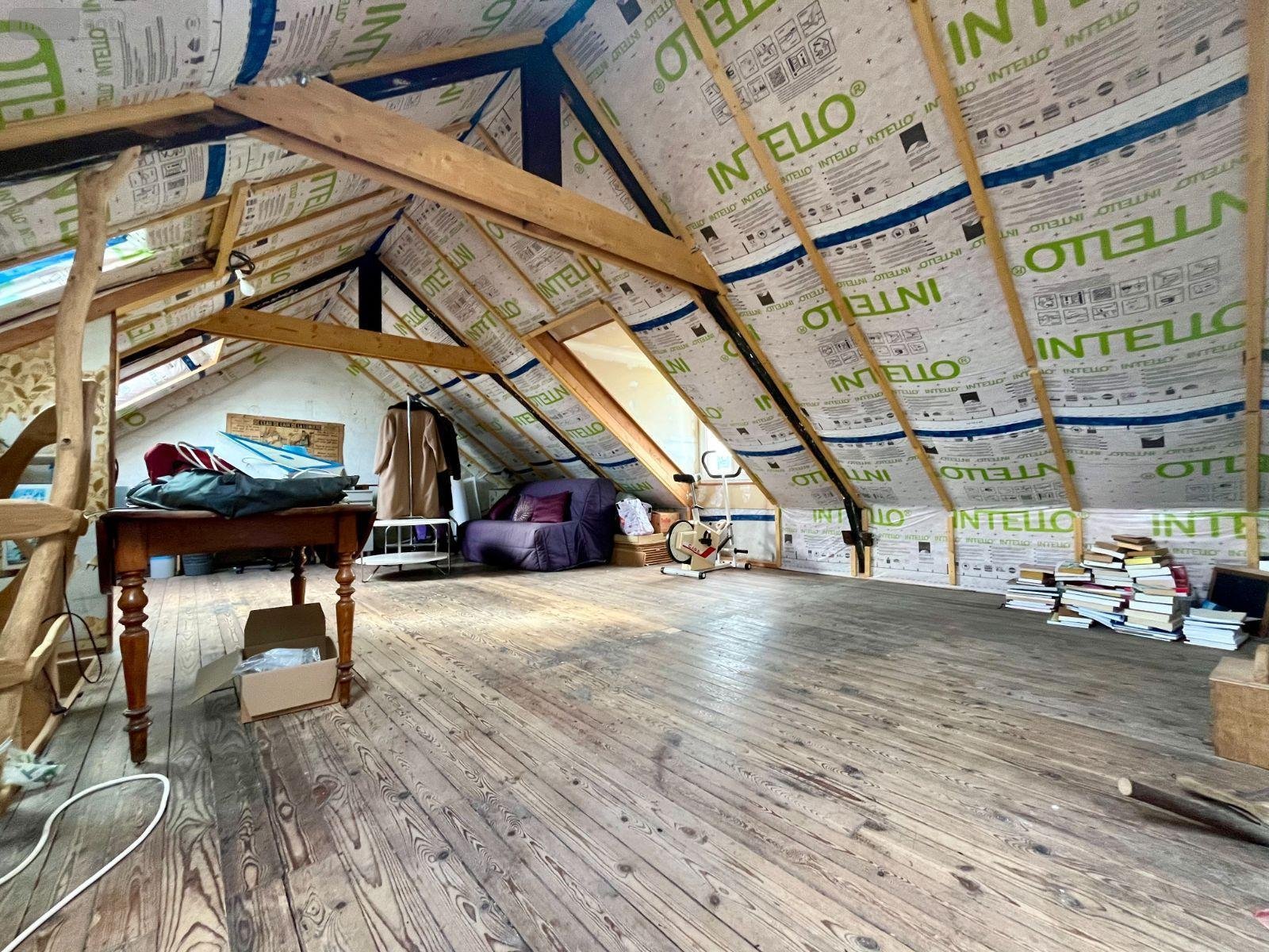 Grande pièce sous combles d'environ 25 m² au sol, isolée, avec plancher bois et plusieurs ouvertures, offrant un bel espace supplémentaire.