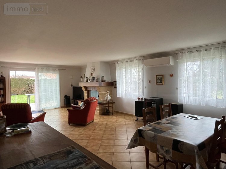 Maison à Vendre à Coutras (33230) en Gironde (33) sur 2000 m² de terrain dans un secteur calme, maison 110 m² hab, lumineuse, en bon état sur sous-sol comprenant une entrée, un séjour avec cheminée/insert (49,4 m²) ouvert sur coin cuisine (13 m²), deux chambres (13,4 m², 13,2 m²), salle d'eau (7,8m²), sous-sol avec une cuisine d'été, buanderie, atelier, grand garage