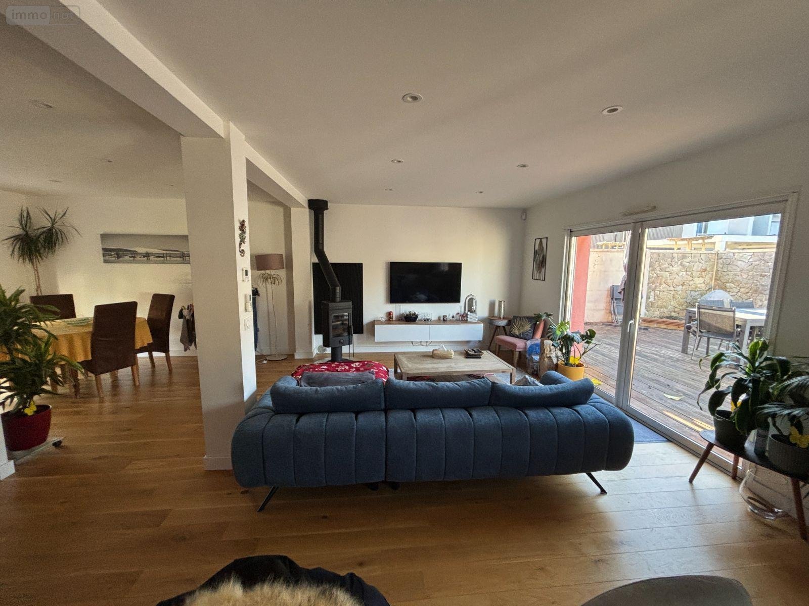 RDC : Entrée 10 m² avec placards, grand salon salle à manger cuisine ouverte de 49 m² avec de grandes baies vitrées sur terrasse bois et piscine. La cuisine aménagée et équipée est récente. Cellier/buanderie attenante de 9 m², garage attenant 14.4 m², WC 1.2 m², Bureau 4.5 m².