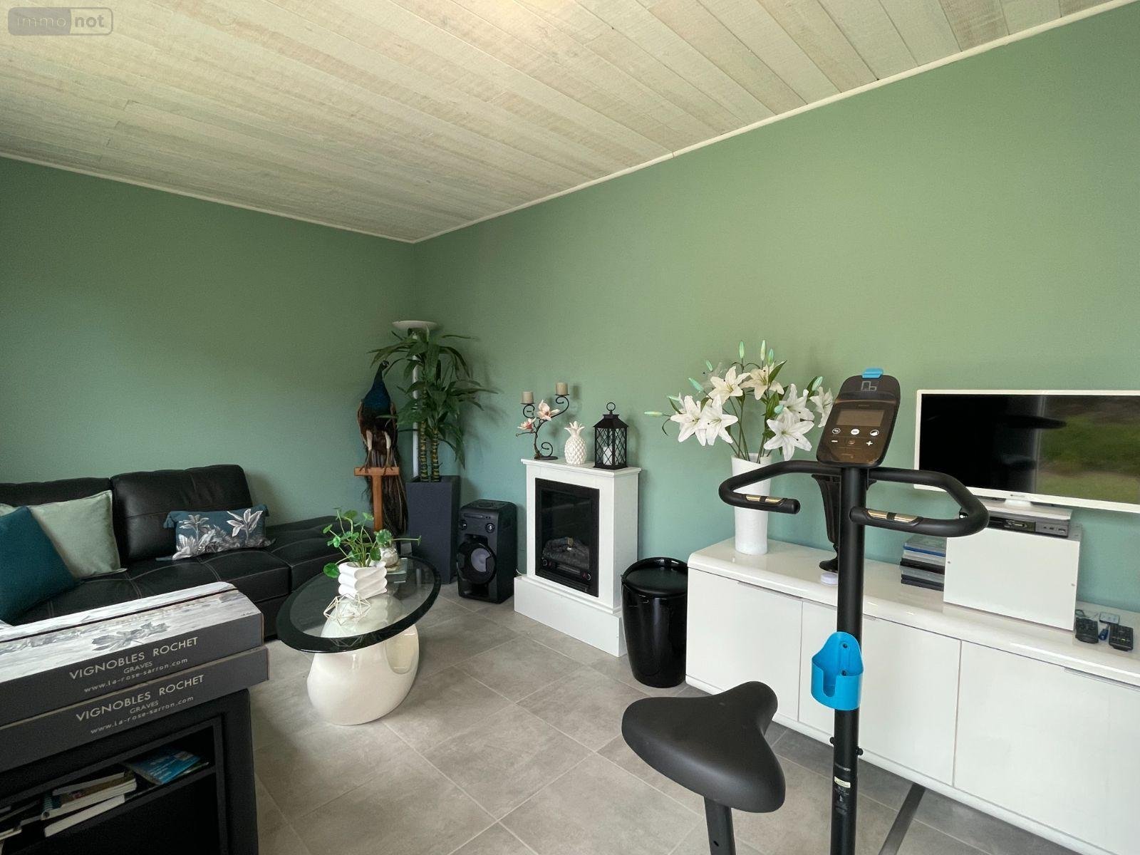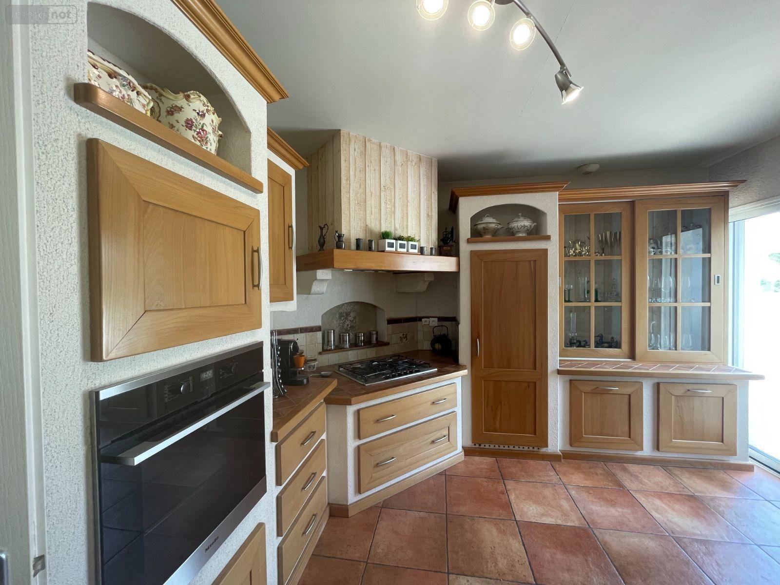 La pièce de vie, baignée de lumière naturelle, s'ouvre largement sur un jardin paysager soigneusement entretenu. La charpente apparente donne du caractère à l'ensemble, tandis que la cuisine en bois massif, réalisée sur mesure, apporte charme et convivialité. Parfaitement intégrée, elle offre un espace pratique et agréable pour cuisiner et recevoir.