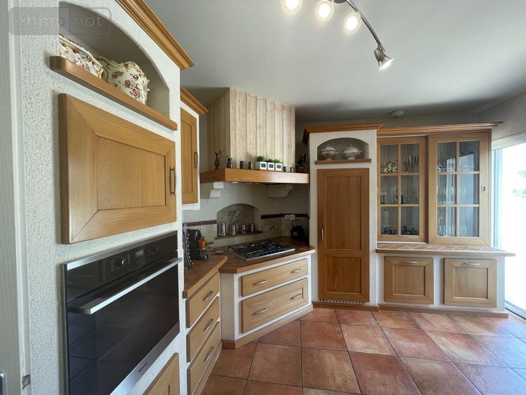 Dès l'entrée, on est frappé par la hauteur sous plafond et les volumes généreux. La pièce de vie, baignée de lumière naturelle, s'ouvre largement sur un jardin paysager soigneusement entretenu. La charpente apparente donne du caractère à l'ensemble, tandis que la cuisine en bois massif, réalisée sur mesure, apporte charme et convivialité. Parfaitement intégrée, elle offre un espace pratique et agréable pour cuisiner et recevoir.