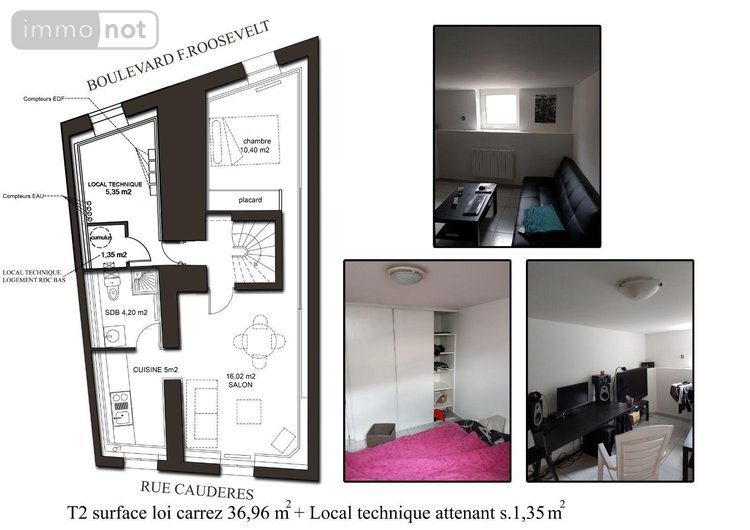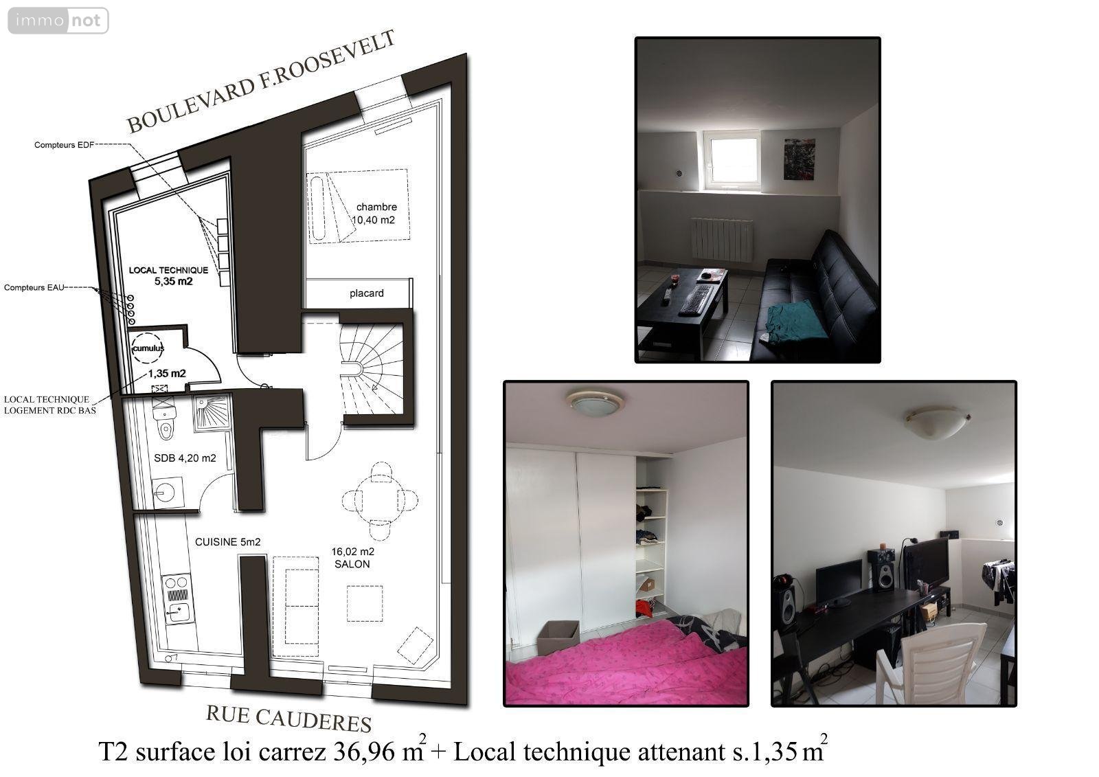 A vendre à BORDEAUX, à proximité de la barrière de Toulouse, dans un immeuble en pierre de 4 logements, un T2 de 36.962m², en rez de chaussée semi enterré, comprenant : un séjour de 17.08m², une cuisine de 4.65m², une salle d'eau avec WC sanibroyeur (3.57m²) et une chambre avec placard de 10.23m², et un couloir de 1.43m².