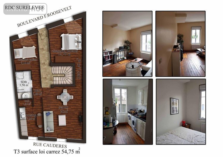 A vendre à Bordeaux Boulevard Franklin Roosevelt, un appartement de type T3, d'une surface de 54.75m², comprenant : séjour (20m²), cuisine (7.20m²), salle d'eau avec WC (3.50m²), dégagement (1.40m²), cellier (0.85m²) et 2 chambres (12.70m² et 9.10m²).