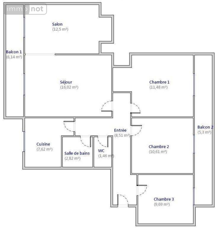 Il dispose d'un séjour double prolongé par un balcon offrant une vue dégagée, une cuisine séparée et un wc. L'espace nuit comprend une salle de bains et 3 chambres reliées par un balcon.
