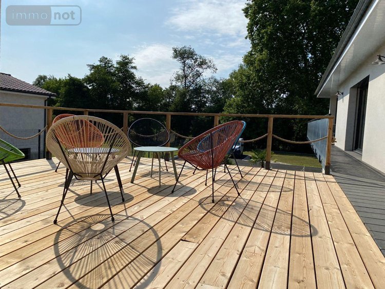 À l'extérieur, la maison dispose de deux terrasses accessibles depuis la pièce de vie, un barbecue couvert, de plusieurs espaces verts paysagés, d'un parking en enrobé.