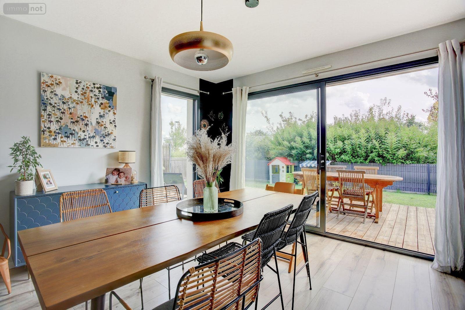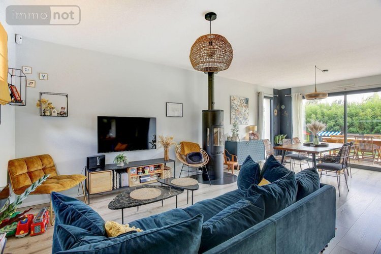 15 mn de Rennes, belle contemporaine, sans vis-à-vis, lumineuse, intérieurs soignés, décoration chaleureuse, parquets, Elle se compose au rez-de-chaussée, un séjour salon avec poele à bois, donnant sur une cuisine aménagée et équipée, une chambre, salle d'eau, wc, rangement, buanderie, garage.