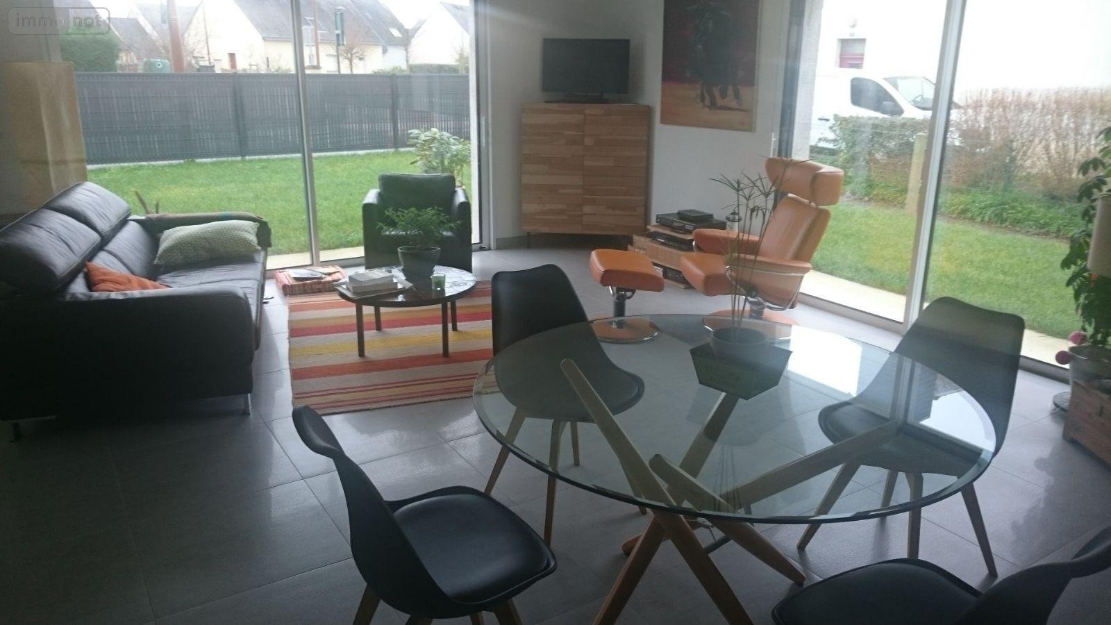 Maison à louer à Bédée (Ille et Vilaine), comprenant au rez-de-chaussée, un grand salon/séjour très lumineux, ouvert sur la cuisine aménagée et équipée d'une hotte, une arrière-cuisine, un dégagement (dressing ou coin bureau), une chambre avec salle d'eau privative, WC avec lave-mains,. A l'étage, trois chambres avec placards, une salle de bain et WC.