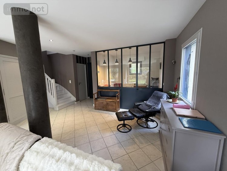 Une entrée avec WC, un bureau, un salon-séjour spacieux et lumineux, une cuisine aménagée et équipée, une arrière-cuisine ainsi qu'un garage attenant.