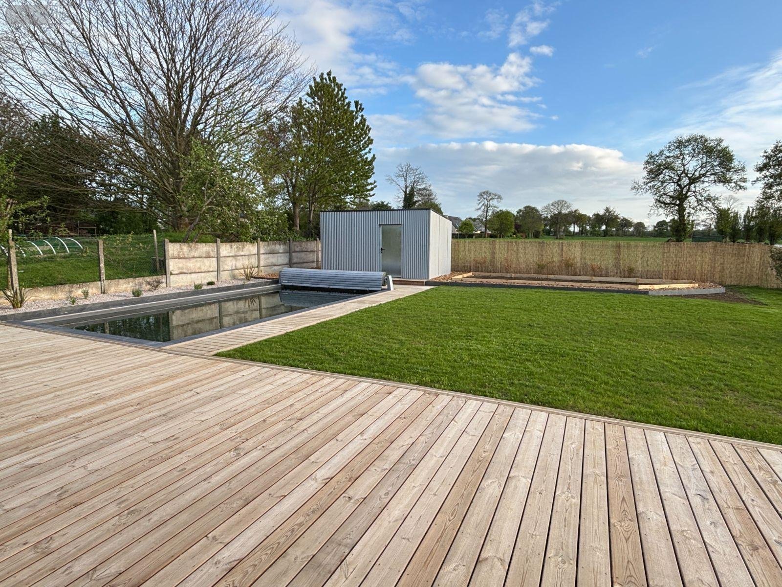 Côté extérieur, le terrain de 800m² a été entièrement aménagé avec d'une part, côté Nord, un grande cour gravillonnée permettant de stationner 3 à 4 véhicules, et d'autre part, côté Sud un espace jardin avec sa grande terrasse de 50m², sa piscine 8x4 chauffée et sécurisée, un abri de jardin de 12m² pouvant accueillir douche et WC, et son espace potager.